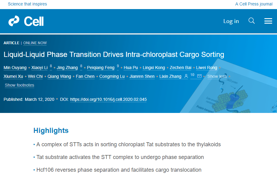 3月13日,国产亚洲精品久久久久久久_无码AV免费精品一区二区三区_99久久久无码国产精品免费人妻_精品人妻无码一区二区三区在线_无码专区久久综合久综合字幕_久久精品国产一区二区三区四区_真实一级一级一片免费视频_特级精品毛片免费观看_国产成人无码AA片免费看生命科学学院、省部共建生物催化与酶工程国家重点实验室欧阳敏教授在国际顶级期刊《Cell》上发表题为“Liquid-liquid phase transition drives intra-chloroplast cargo sorting ”(《液-液相分离调控叶绿体蛋白的运输和分选》的研究论文。该论文由国产亚洲精品久久久久久久_无码AV免费精品一区二区三区_99久久久无码国产精品免费人妻_精品人妻无码一区二区三区在线_无码专区久久综合久综合字幕_久久精品国产一区二区三区四区_真实一级一级一片免费视频_特级精品毛片免费观看_国产成人无码AA片免费看,中科院植物研究所以及河南大学共同完成,欧阳敏教授为本文唯一第一作者,中科院植物研究所张立新教授为通讯作者。这是国产亚洲精品久久久久久久_无码AV免费精品一区二区三区_99久久久无码国产精品免费人妻_精品人妻无码一区二区三区在线_无码专区久久综合久综合字幕_久久精品国产一区二区三区四区_真实一级一级一片免费视频_特级精品毛片免费观看_国产成人无码AA片免费看教师首次以第一作者身份在《Cell》上发表研究论文(见图1)。