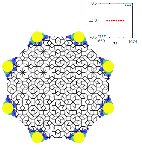 最近,一类新的拓扑绝缘体-高阶拓扑绝缘体(Higher-Order Topological Insulators)被提出并且引起了研究热潮。与先前的拓扑绝缘体相比,该类拓扑绝缘体表现出完全不同的体态-边界态对应关系。以二维为例,通常的拓扑绝缘体具有一维无能隙边界态,而二阶拓扑绝缘体拥有无能隙的零维拐角态(Corner States)。现有的高阶拓扑绝缘体都需要晶体对称性的拓扑保护,那么是否存在超越现有框架的高阶拓扑绝缘体呢?该研究团队发现在二维准晶中存在一类截然不同的高阶拓扑绝缘体,它受到一种晶体所不具有的,八重旋转对称性的保护,边界上具有八重对称性的无能隙拐角态(如图所示),是一类新的对称性保护的拓扑物态。