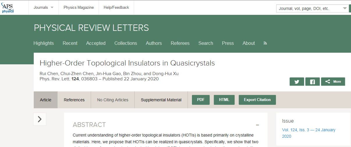 近日,物理学顶级期刊《物理评论快报》(Physical Review Letters)发表了我校物理与电子科学学院许东辉副教授、周斌教授关于高阶拓扑绝缘体的重要原创工作,题目为 “Higher-Order Topological Insulators in Quasicrystals”(准晶中的高阶拓扑绝缘体),国产亚洲精品久久久久久久_无码AV免费精品一区二区三区_99久久久无码国产精品免费人妻_精品人妻无码一区二区三区在线_无码专区久久综合久综合字幕_久久精品国产一区二区三区四区_真实一级一级一片免费视频_特级精品毛片免费观看_国产成人无码AA片免费看为论文第一和通讯单位,苏州大学、华中科技大学为合作研究单位。周斌教授的博士生陈锐(现为南方科技大学博士后)为论文第一作者,许东辉副教授、周斌教授为论文共同通讯作者。本工作得到国家自然科学基金、楚天学者“楚天学子”计划的支持。